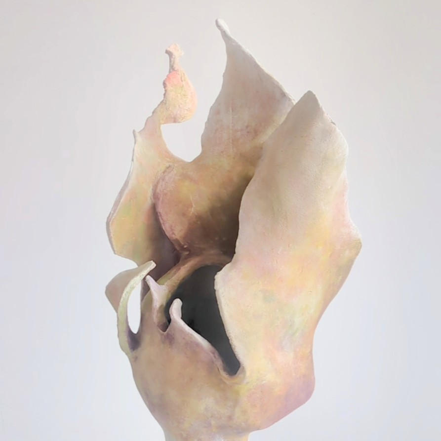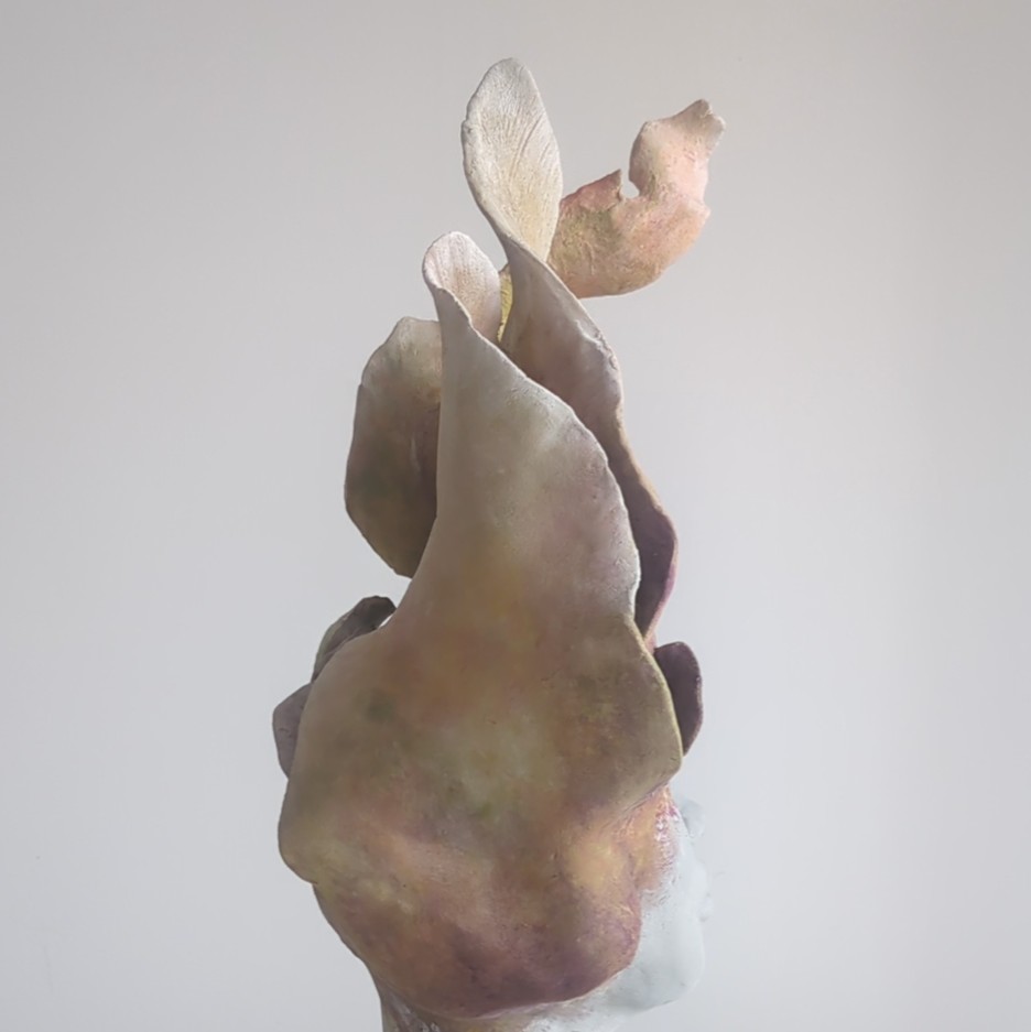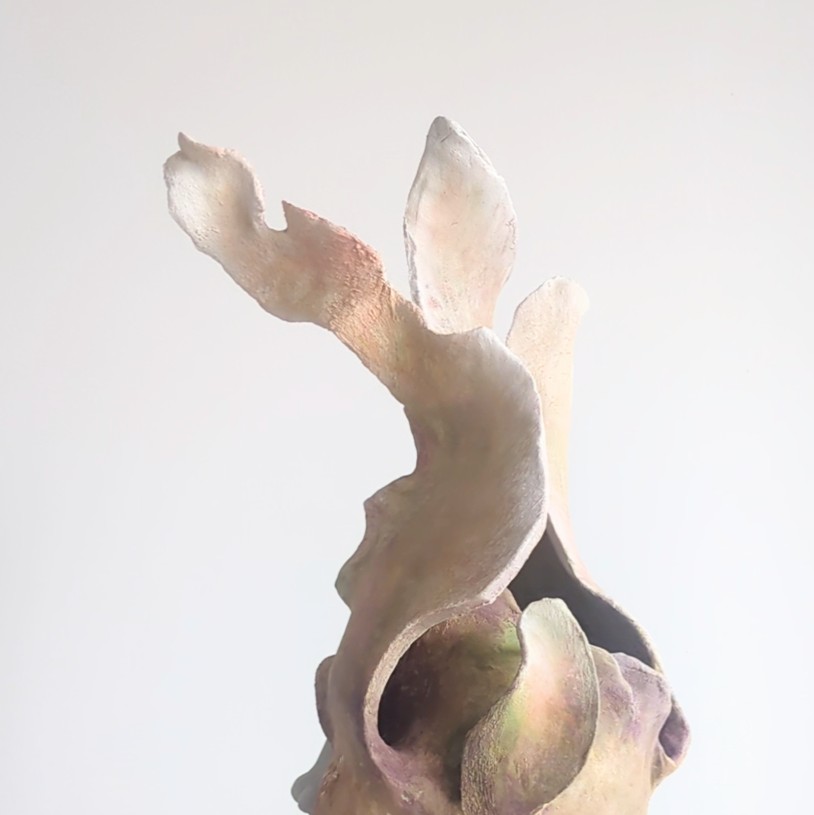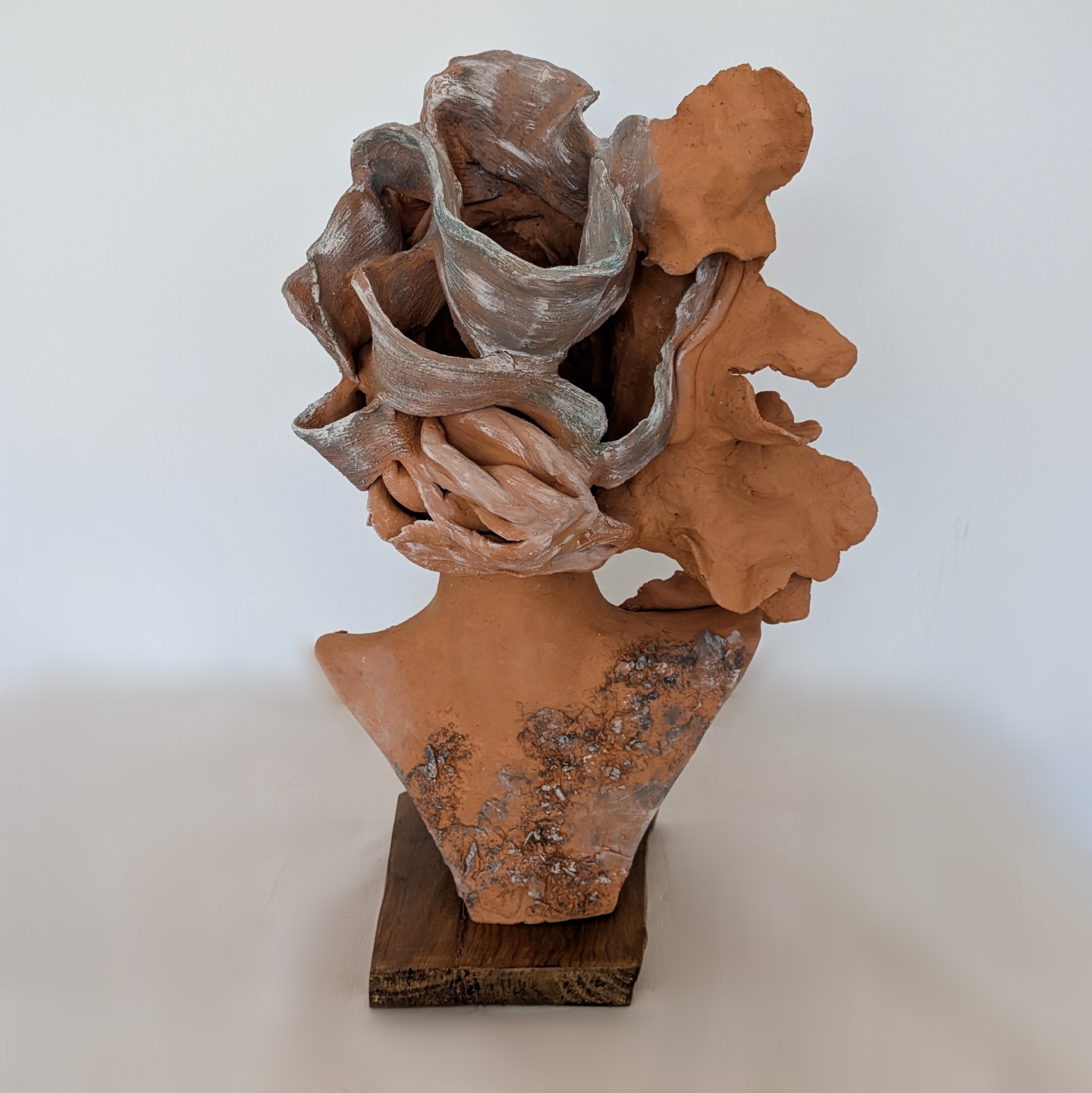 Façonnée de A à Z, depuis la préparation de la terre brute jusqu’à la mise en forme finale. Le modelage a ensuite donné naissance à Gesse qui tire son nom du lieu où elle est née. Elle semble émerger d’un rêve avec des formes florales et minérales se déploient comme une chevelure habitée par le souffle du vent. La matière brute se mêle à des éclats argentés, rappelant la danse entre la nature et l’imaginaire. Ancrée sur son socle de bois, la sculpture paraît à la fois fragment d’écorce et apparition fugitive, messagère d’un autre monde.